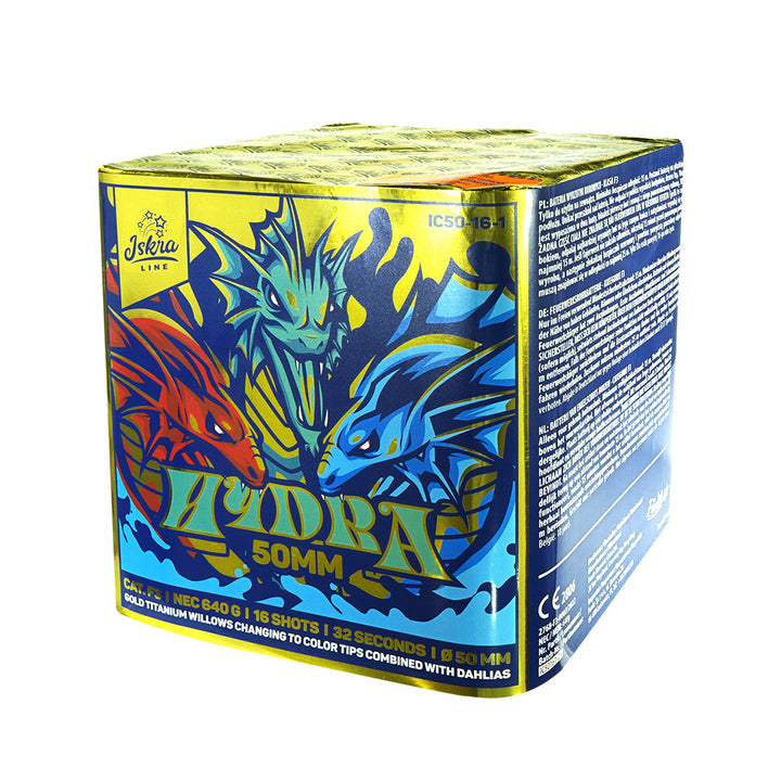 16 Schuss Batterie im Kaliber 50mm mit Titangoldweiden mit farbigen Spitzen sowie Dahliensternen.